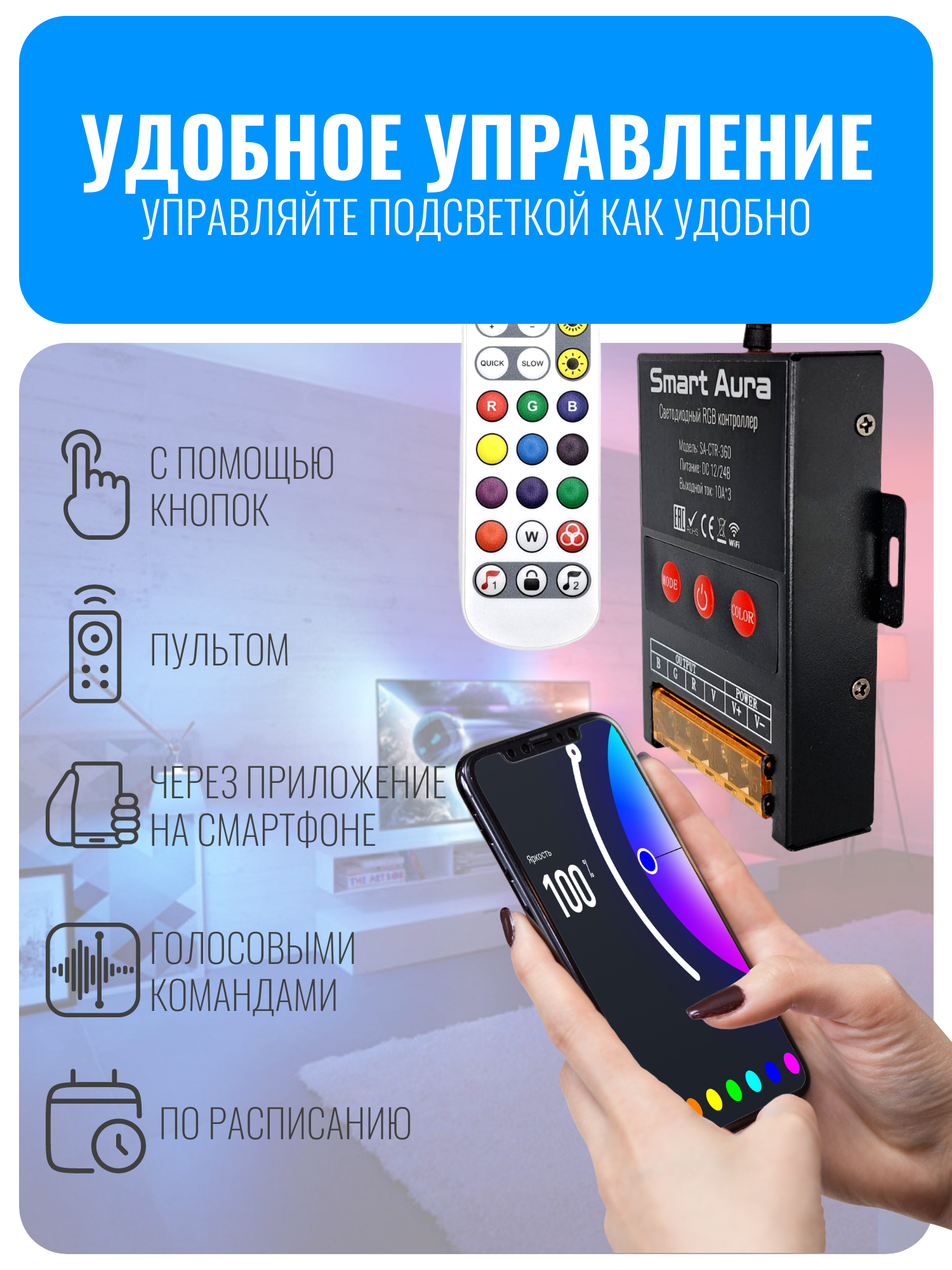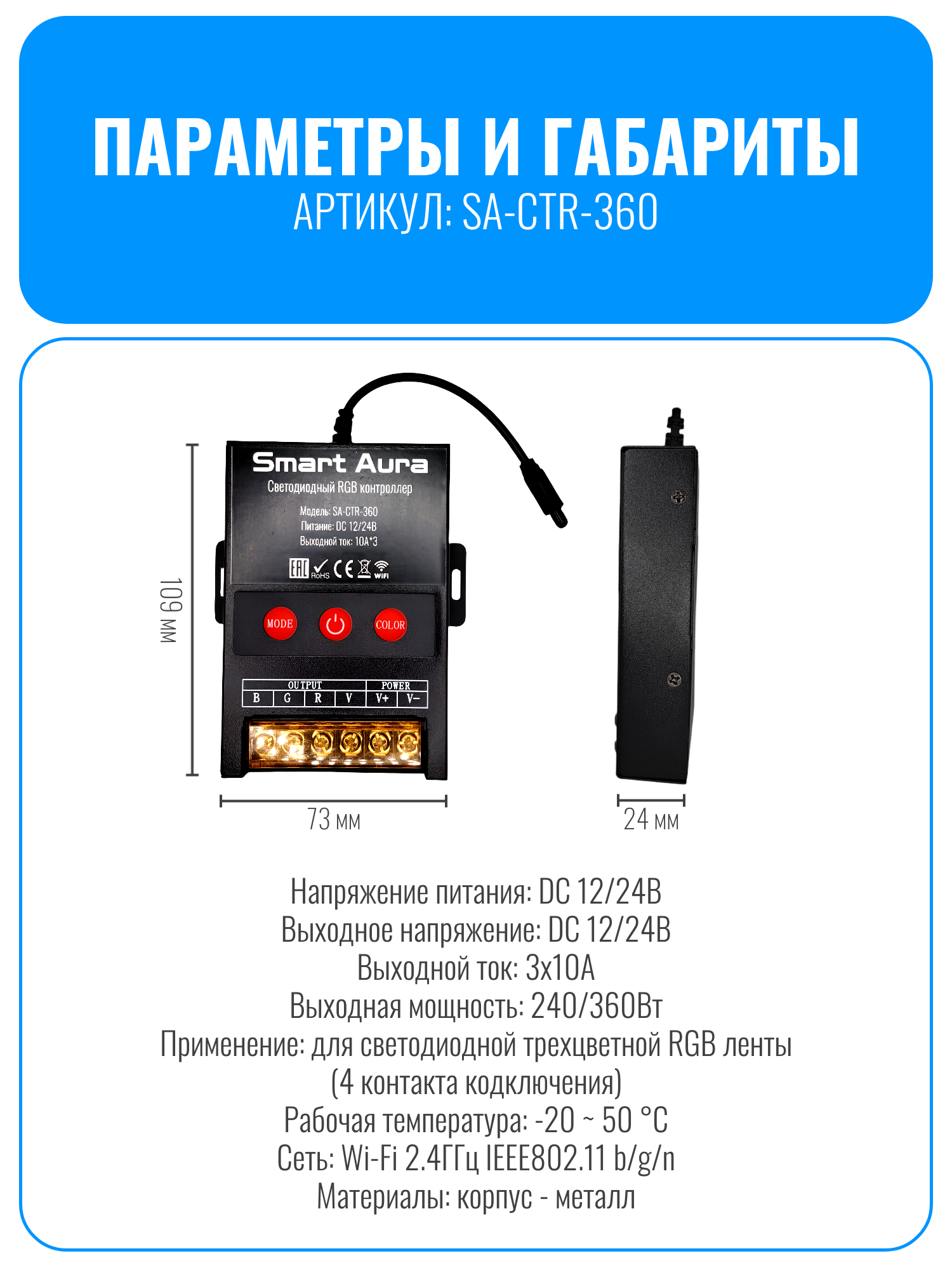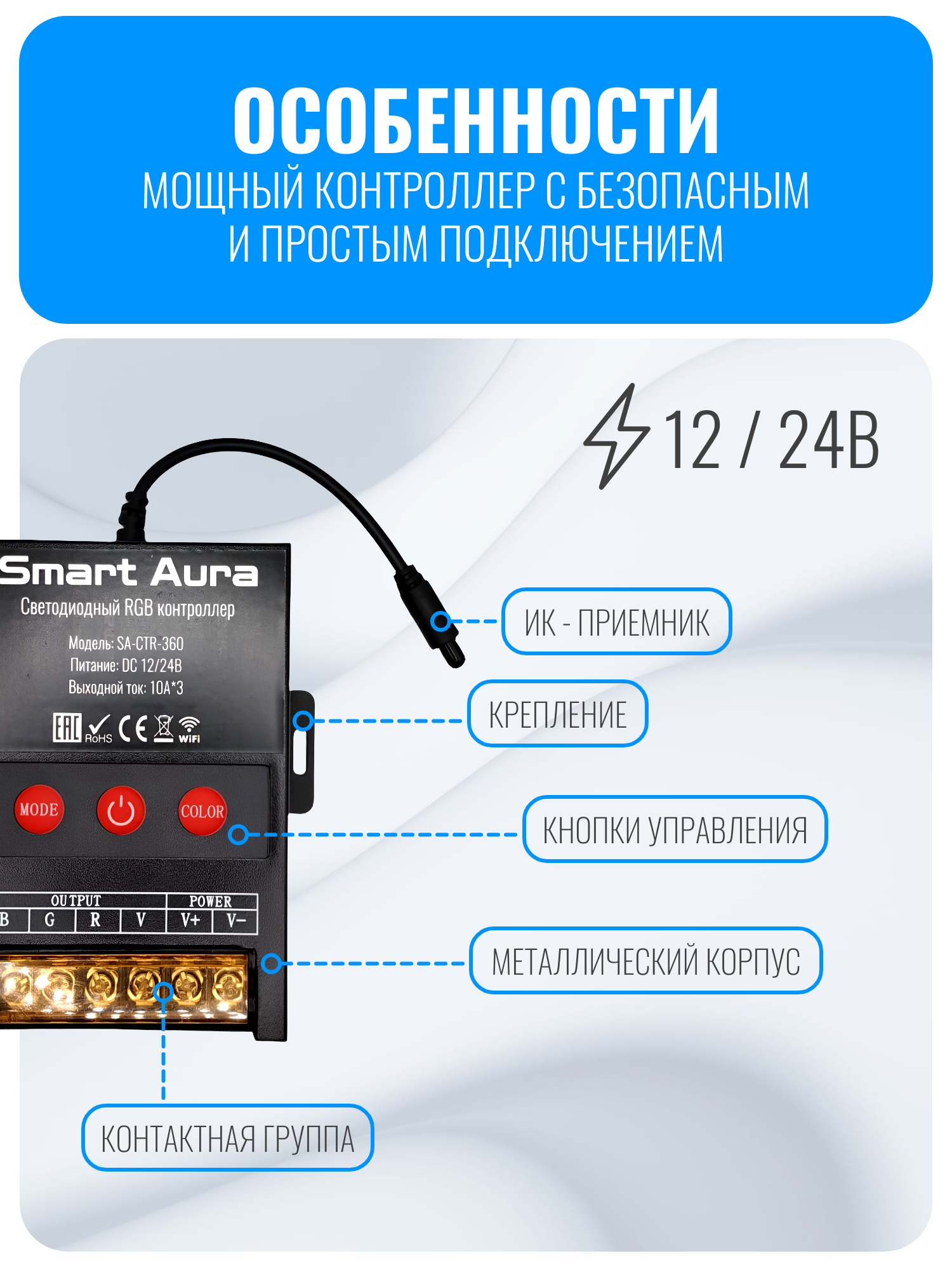 Умный WiFi светодиодный RGB контроллер Smart Aura SA-CTR-360 — это оптимальное решение для управления светодиодной RGB лентой 12 и 24 вольт. Он обладает выдающимися характеристиками: максимальный ток 10А на каждый канал и мощность до 360Вт. Контроллер поддерживает функцию светомузыки, позволяющую ему работать в такт вашей любимой музыке. Его можно использовать как в домашнем интерьере, так и в профессиональных установках, благодаря прочному металлическому корпусу, эффективной системе охлаждения и возможности крепления на стену или другую поверхность. Установите контроллер в скрытом от глаз месте, а провод с ИК-приемником выведите наружу для удобного использования пульта дистанционного управления.