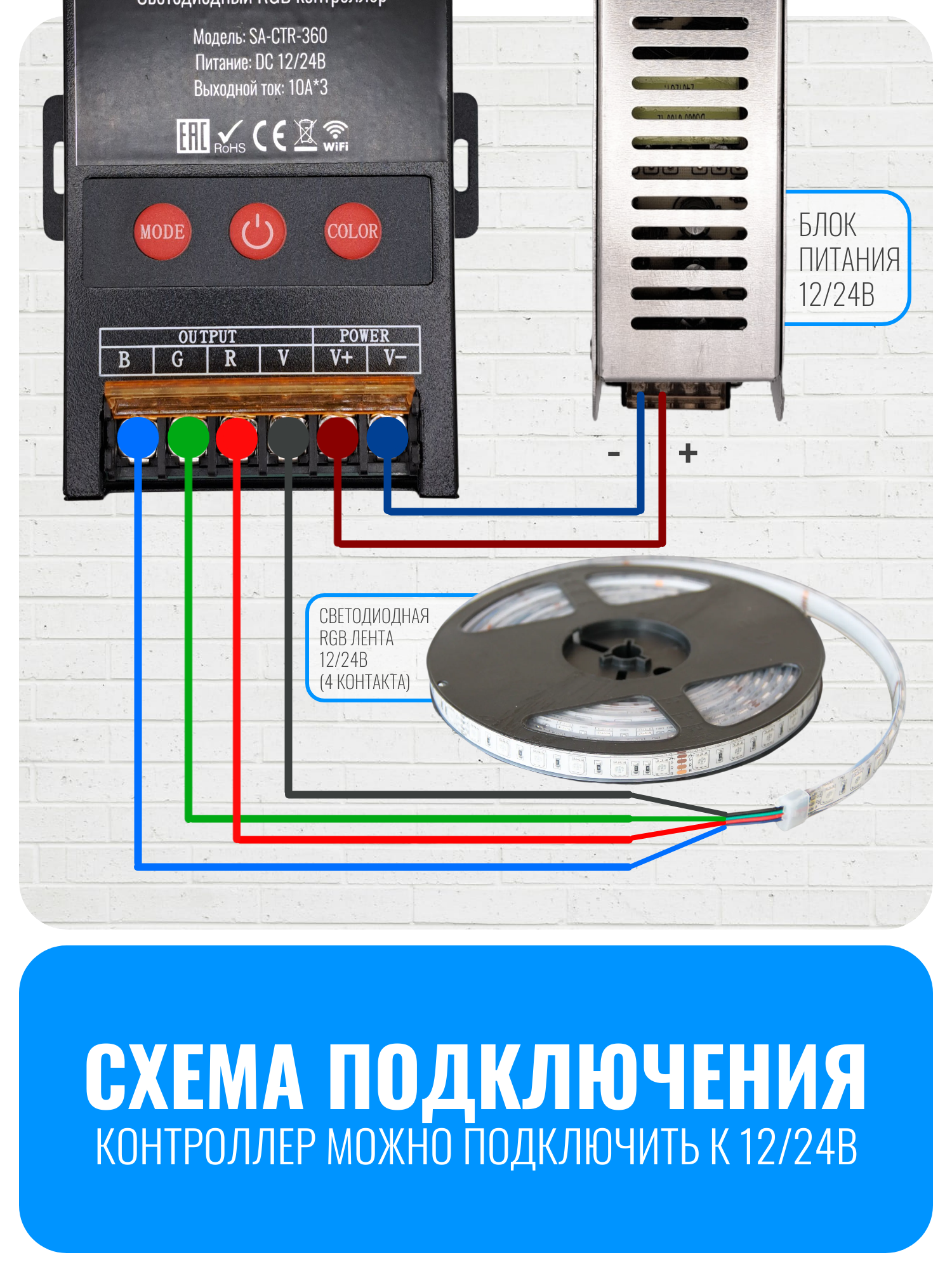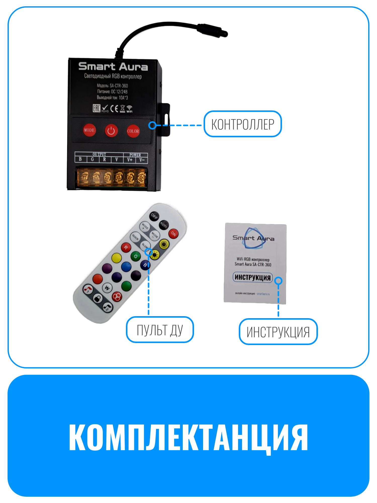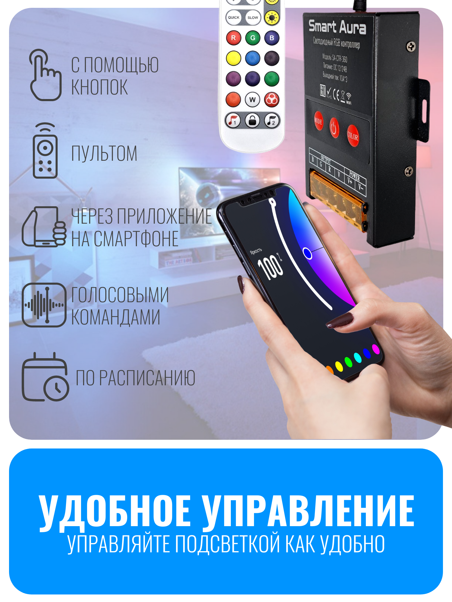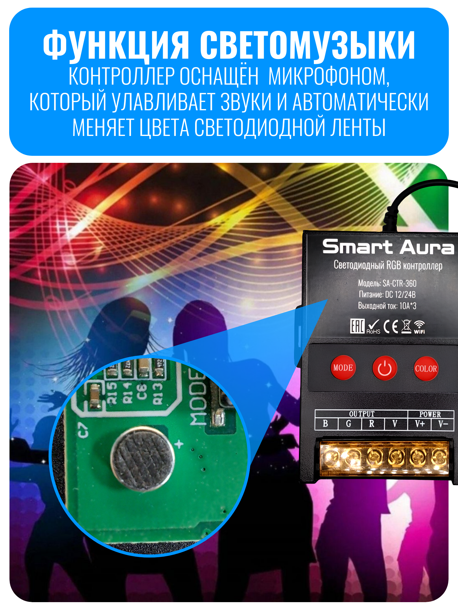 Умный WiFi светодиодный RGB контроллер Smart Aura SA-CTR-360 — это оптимальное решение для управления светодиодной RGB лентой 12 и 24 вольт. Он обладает выдающимися характеристиками: максимальный ток 10А на каждый канал и мощность до 360Вт. Контроллер поддерживает функцию светомузыки, позволяющую ему работать в такт вашей любимой музыке. Его можно использовать как в домашнем интерьере, так и в профессиональных установках, благодаря прочному металлическому корпусу, эффективной системе охлаждения и возможности крепления на стену или другую поверхность. Установите контроллер в скрытом от глаз месте, а провод с ИК-приемником выведите наружу для удобного использования пульта дистанционного управления.
