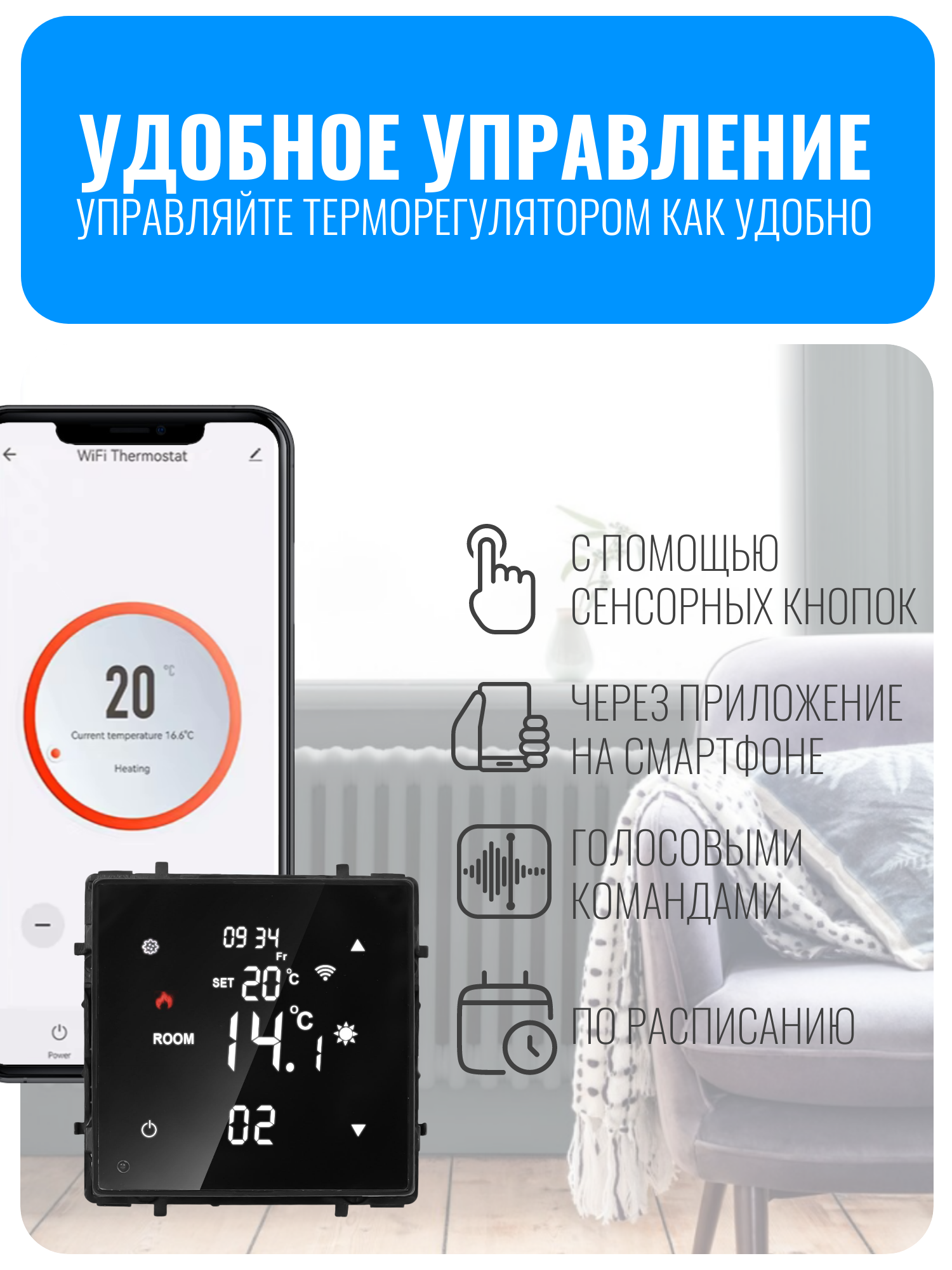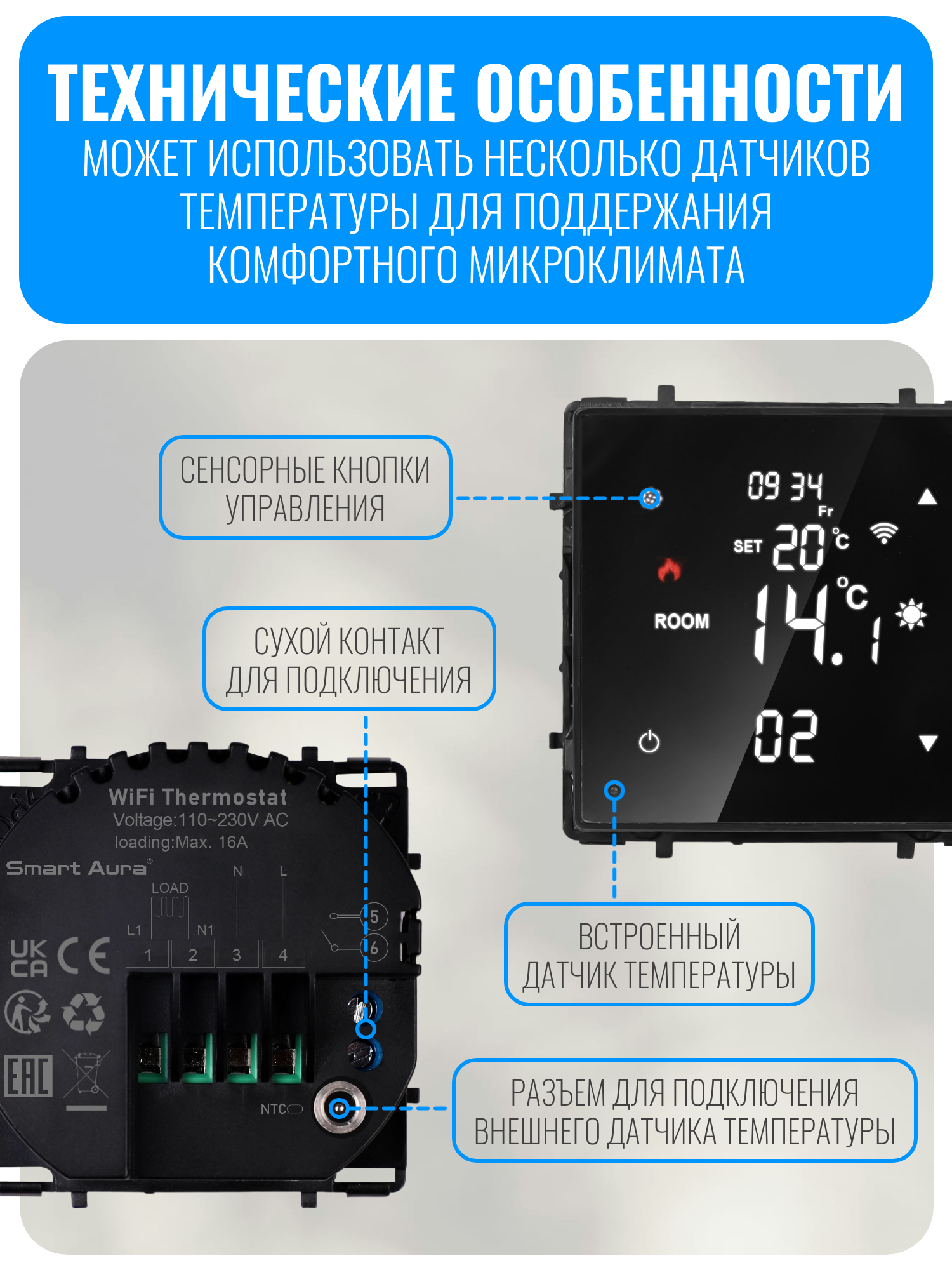 Умный Wi-Fi терморегулятор Smart Aura SA-TE100B для котла отопления - это современное и удобное решение для управления отоплением в вашем доме. Вы можете включать или выключать обогрев голосом или с помощью своего смартфона.
