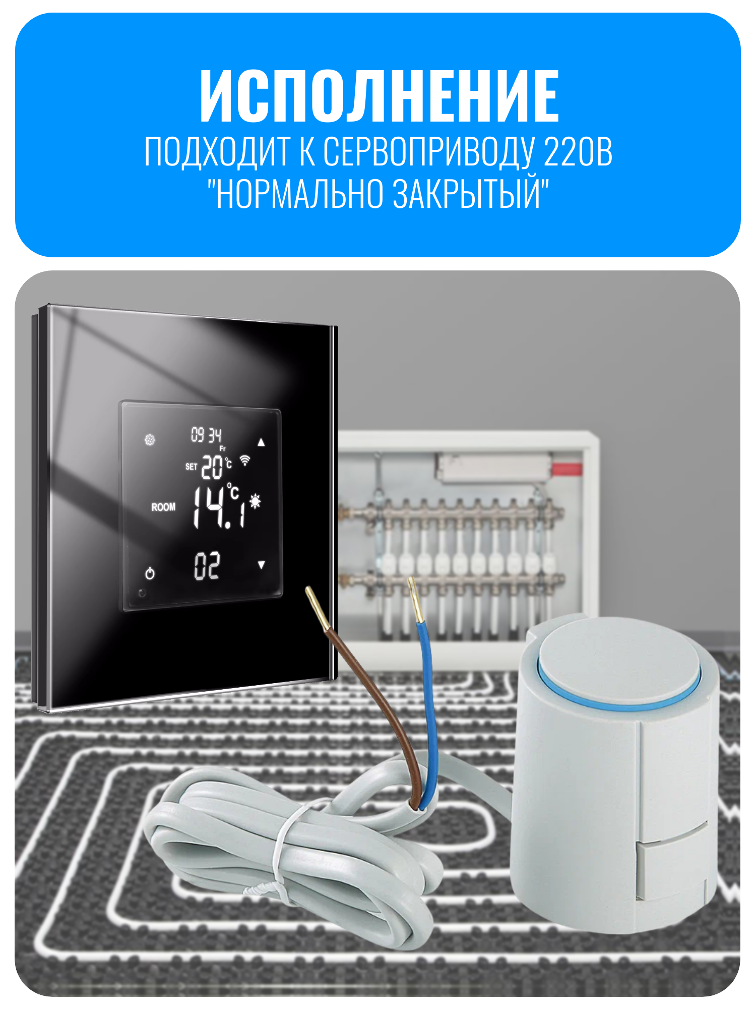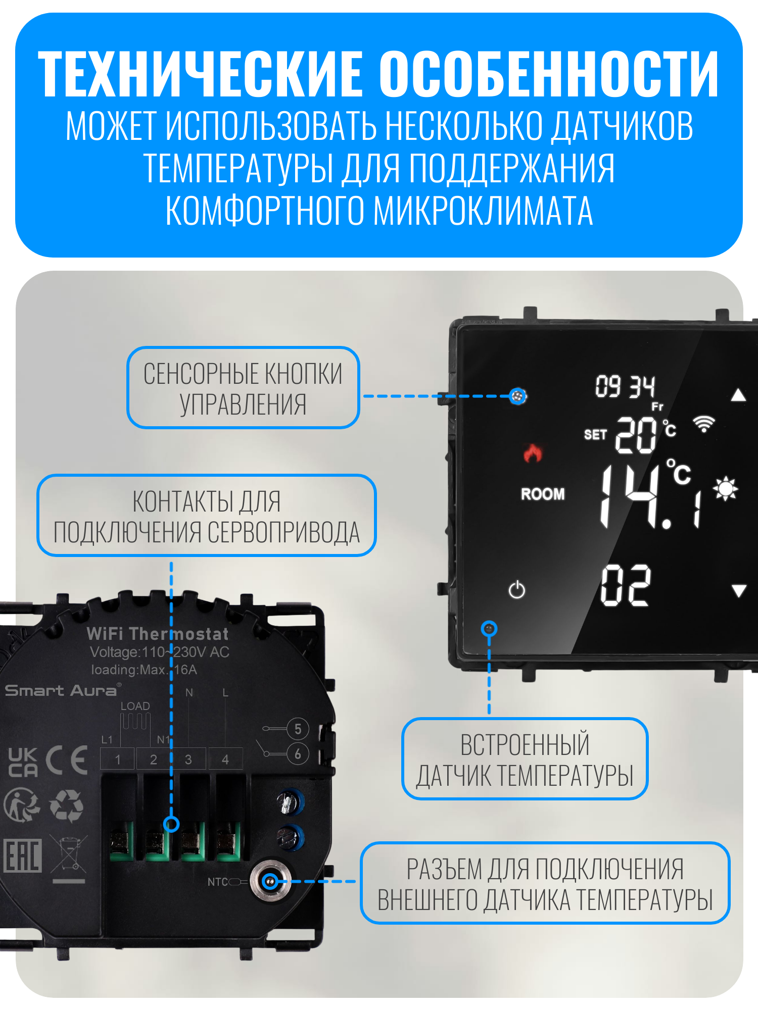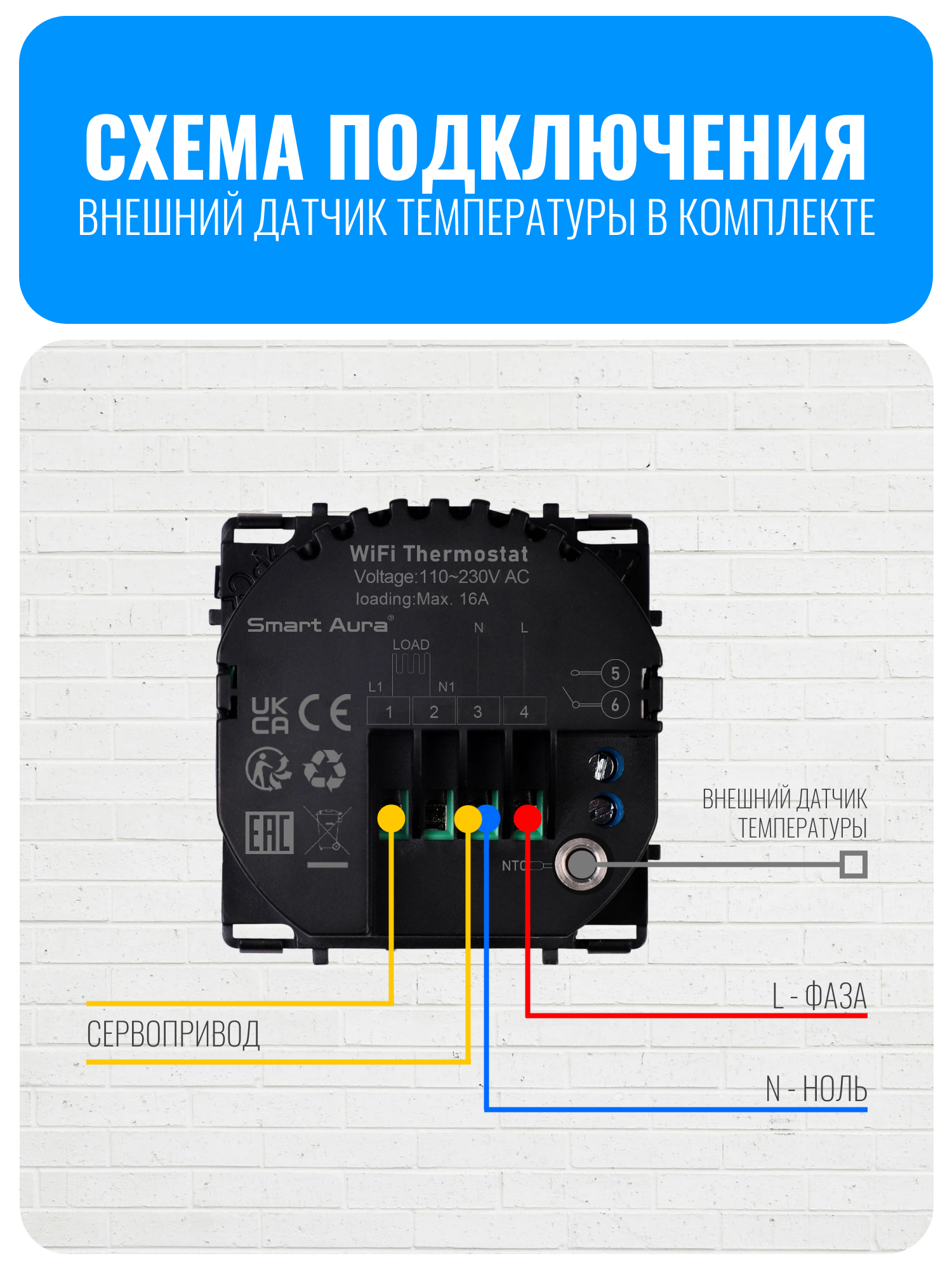 На сенсорном дисплее терморегулятора отображается текущая температура в помещении и температура датчика в полу, что позволяет легко контролировать комфортный климат. Также есть возможность выбирать между программируемым и ручным режимами работы. Программа предоставляет возможность настроить различные временные интервалы для каждого дня недели, по вашим потребностям - шесть интервалов для программирования делает использование более гибким и удобным. Встроенный датчик воздуха позволяет контролировать температуру в помещении, а комплект поставки уже содержит дополнительный датчик для измерения температуры пола. Компактные размеры позволяют легко установить его в стандартном подрозетник 68 мм. Терморегулятор Smart Aura можно использовать с любыми видами сервоприводов 220В, подключение NC "нормально закрытый".