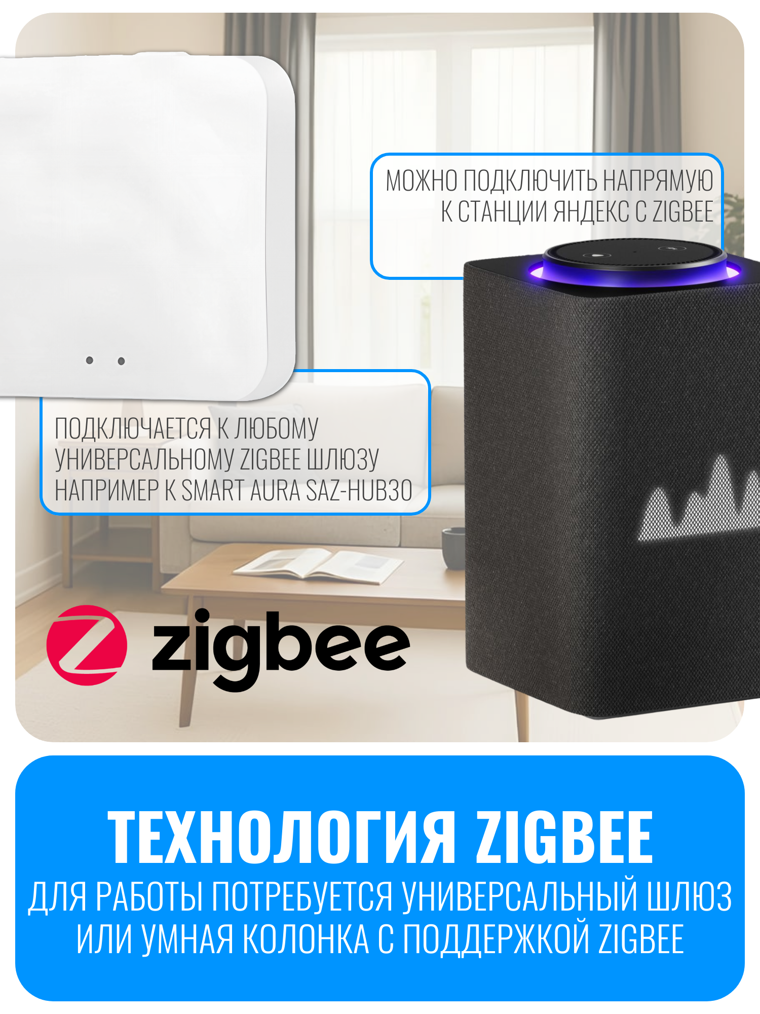 Для подключения необходим универсальный ZigBee-шлюз без привязки к бренду или колонка с поддержкой ZigBee. Управление и настройка осуществляются через приложения Smart Life, DIGMA SmartLife. Если используется колонка с ZigBee, датчик можно добавить напрямую в приложение «Умный дом с Алисой». Устройство совместимо с голосовыми помощниками Яндекс Алиса и VK Маруся.