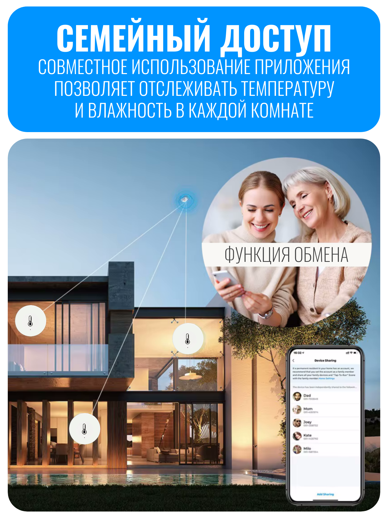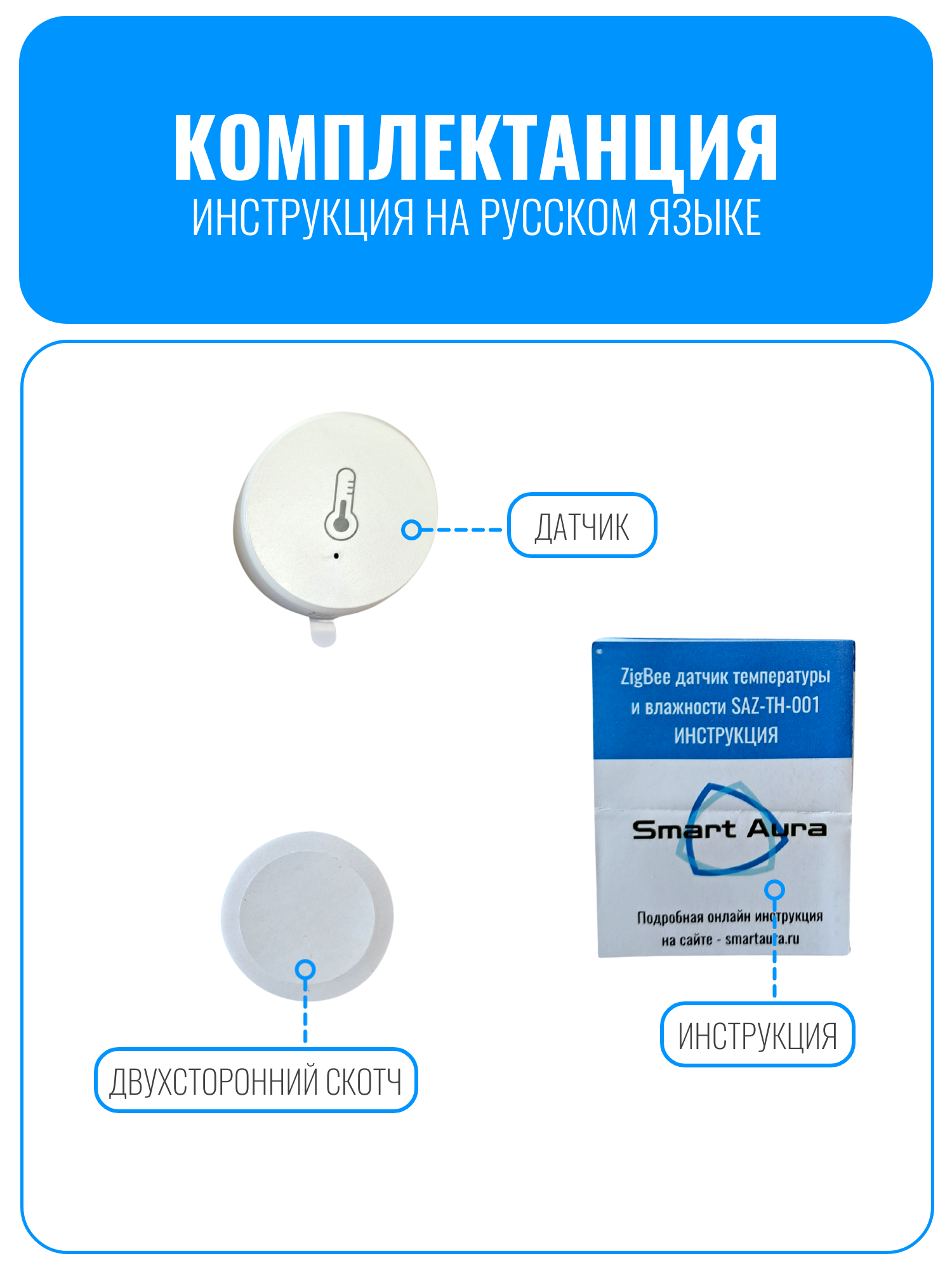 Диапазон измеряемых температур составляет от 0 °C до 50 °C, влажности — от 0% до 95% относительной влажности. Погрешность измерения температуры не превышает ±1 °C, влажности — ±5%. Компактный корпус высотой 13 мм и шириной 40 мм выполнен в лаконичном белом цвете. В комплекте предусмотрена батарейка CR2450, обеспечивающая автономную работу датчика.