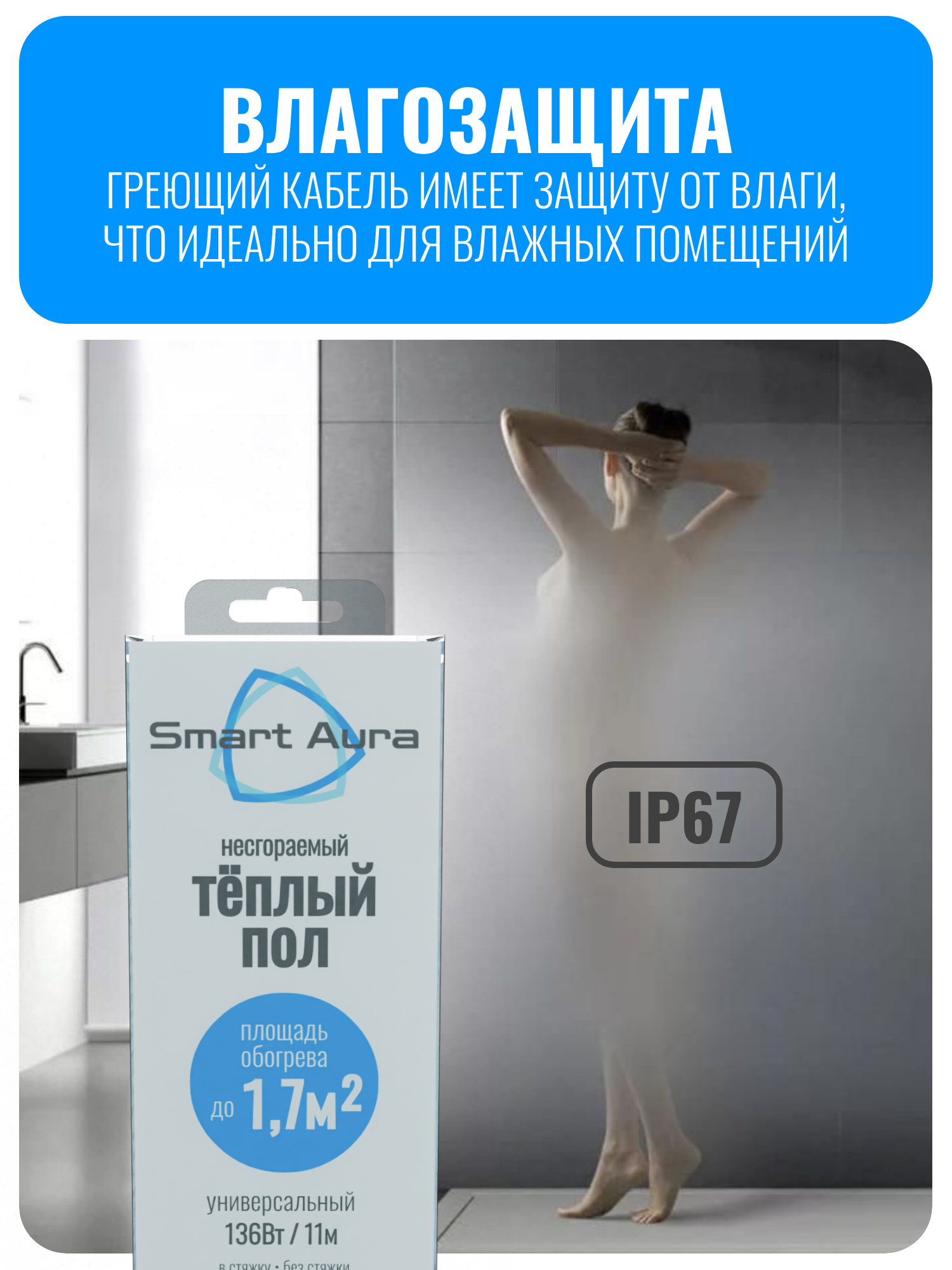 Универсальный несгораемый теплый пол Smart Aura SA-FE136C представляет собой комплект, в который входит 11 метров кабеля, предназначенного для обогрева площади в 1,7 квадратных метров. Этот комплект отличается высокой надежностью и эффективностью благодаря использованию современных технологий и материалов.