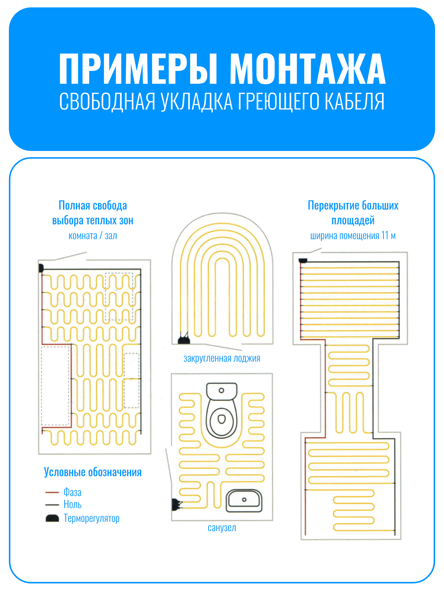 Кабель подходит для установки под любое напольное покрытие: его можно укладывать как в стяжку, так и без нее, под керамогранит, плитку, кварц-винил, линолеум, ковролин и ламинат. Свободная укладка кабеля без использования сетки позволяет монтировать теплый пол в помещениях со сложной геометрией, что делает его универсальным решением для любых интерьеров. Кроме того, греющий кабель не боится запирания мебелью, местного перегрева и перегиба, а также имеет нулевой радиус загиба, что существенно упрощает процесс монтажа и эксплуатации.