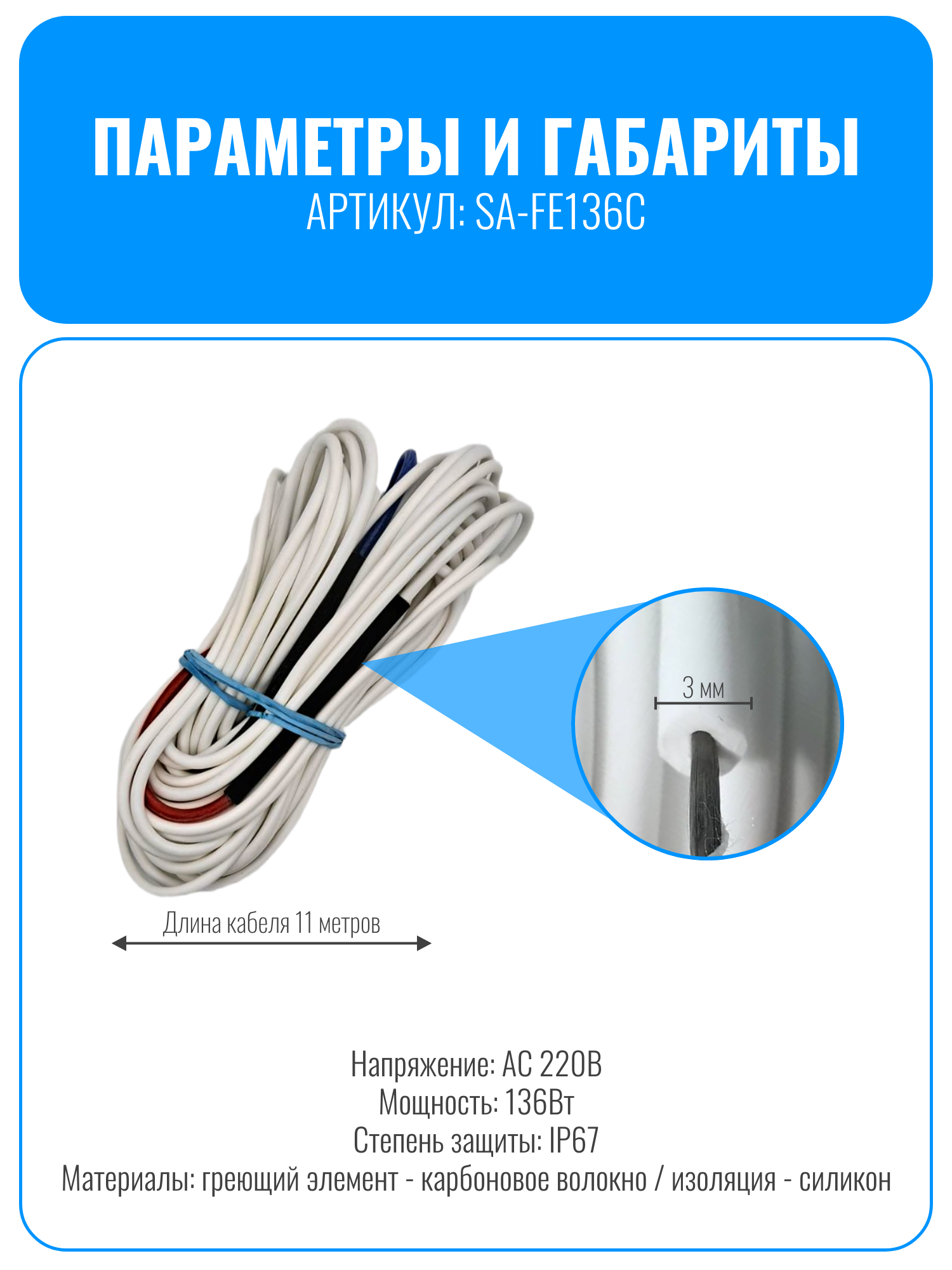 Обогрев осуществляется методом соединения секций кабеля длиной по 11 метров, которые подключаются параллельно. Основным греющим элементом в данном комплекте является карбоновая сверхпрочная нить. Этот материал способен выдерживать экстремальные температуры до 985°С, что гарантирует кабелю устойчивость к перегреву и скачкам напряжения. Это свойство делает его особенно надежным и долговечным в эксплуатации.