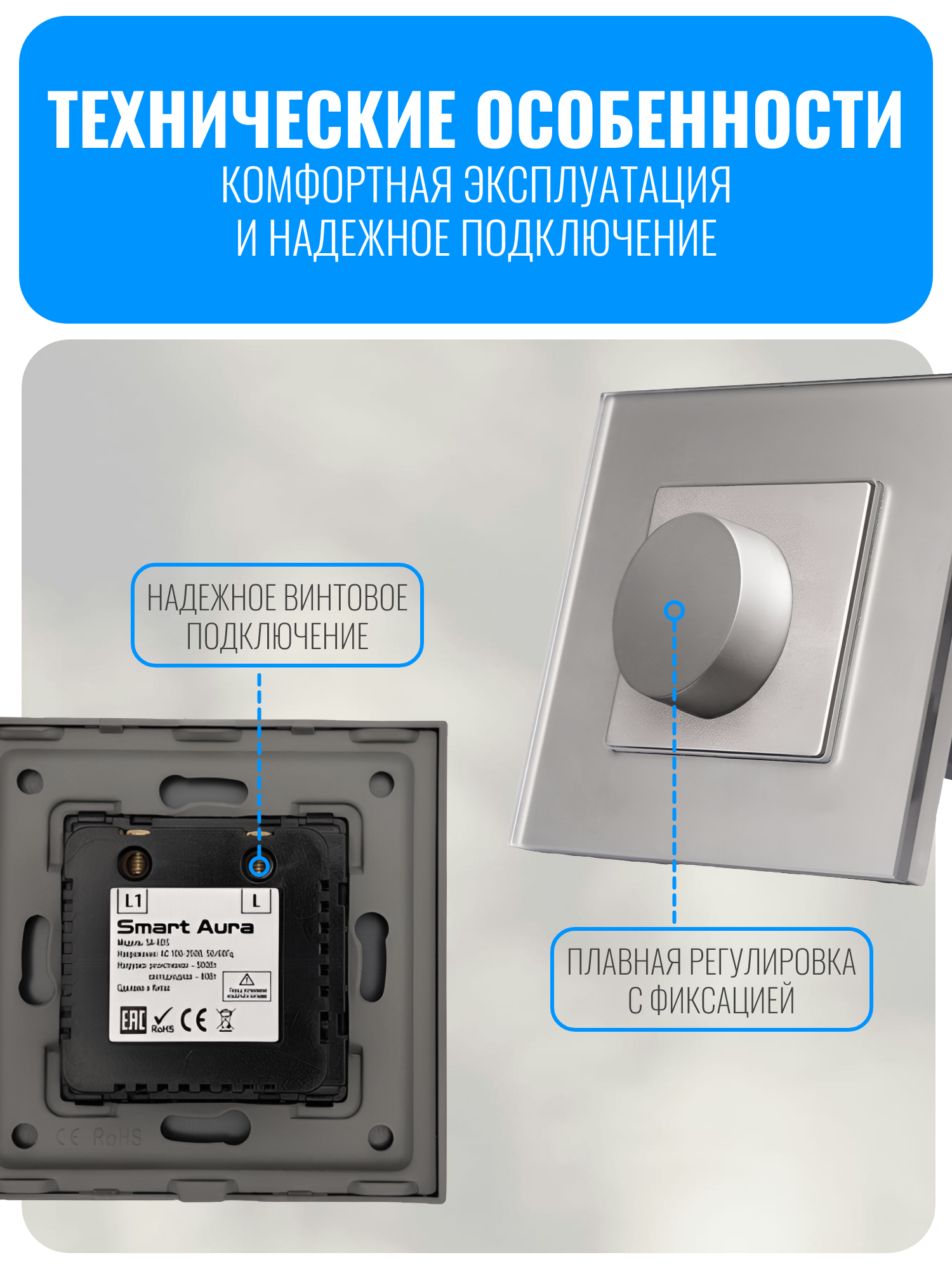 Выключатель-диммер Smart Aura SA-RDS серии Classic предназначен для управления освещением на одной линии электросети: он включает, выключает свет и регулирует его яркость. Устройство подходит для ламп накаливания с максимальной нагрузкой до 500 Вт, а также для диммируемых светодиодных ламп с общей мощностью до 80 Вт. Обратите внимание: используйте только светодиодные лампы с поддержкой диммирования. Обычные светодиодные лампы не будут работать с этим диммером.