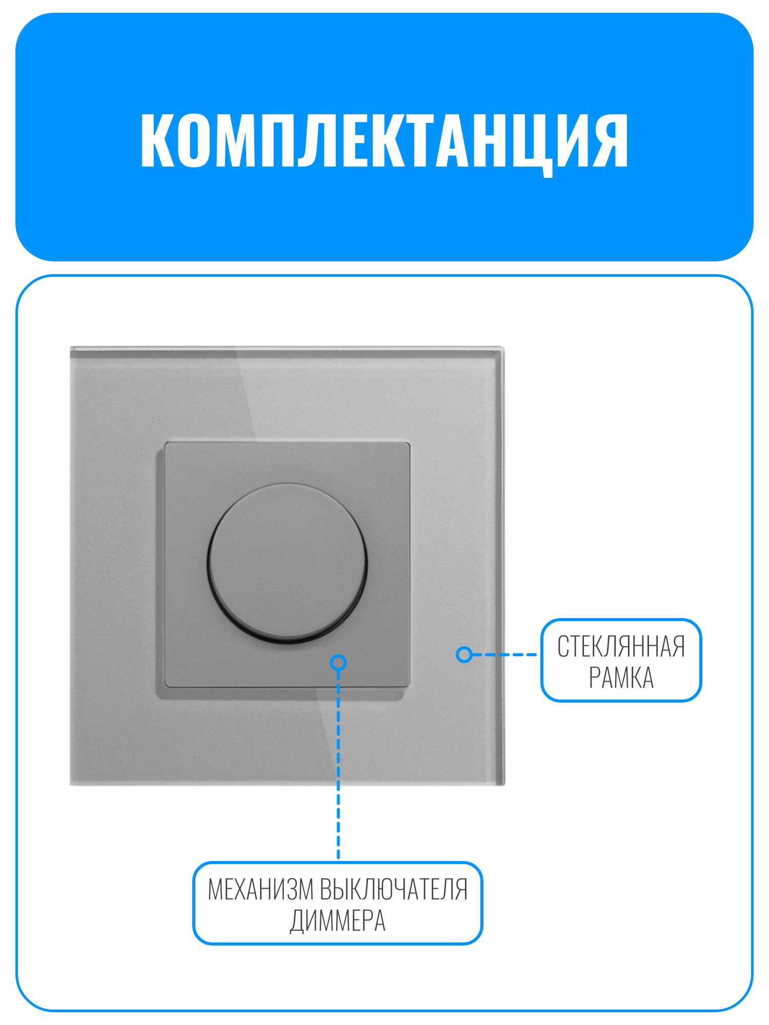 Диммер можно установить как вертикально, так и горизонтально, что упрощает её интеграцию в любой интерьер. В комплекте поставляется механизм диммера и рамка из закаленного стекла.
