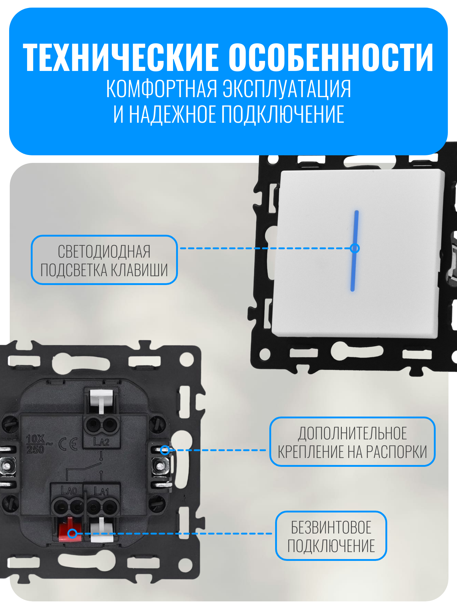 Выключатель этой серии можно комбинировать между собой, создавая единый блок из нескольких устройств — до пяти постов подряд. Матовая поверхность с покрытием софт-тач приятна на ощупь и защищает от появления отпечатков пальцев и мелких царапин. Выключатель подходит как для вертикального, так и для горизонтального монтажа.