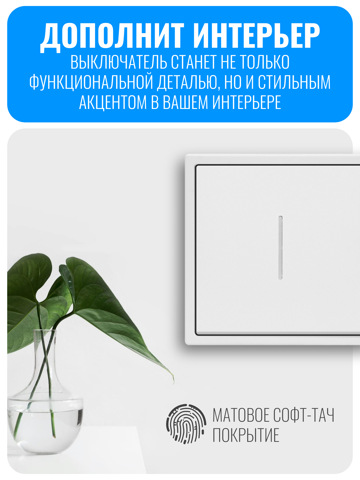 Выключатель этой серии можно комбинировать между собой, создавая единый блок из нескольких устройств — до пяти постов подряд. При этом между отдельными элементами нет перегородок, что обеспечивает цельный и аккуратный внешний вид всей конструкции. Матовая поверхность с покрытием софт-тач приятна на ощупь и защищает от появления отпечатков пальцев и мелких царапин. Выключатель подходит как для вертикального, так и для горизонтального монтажа.