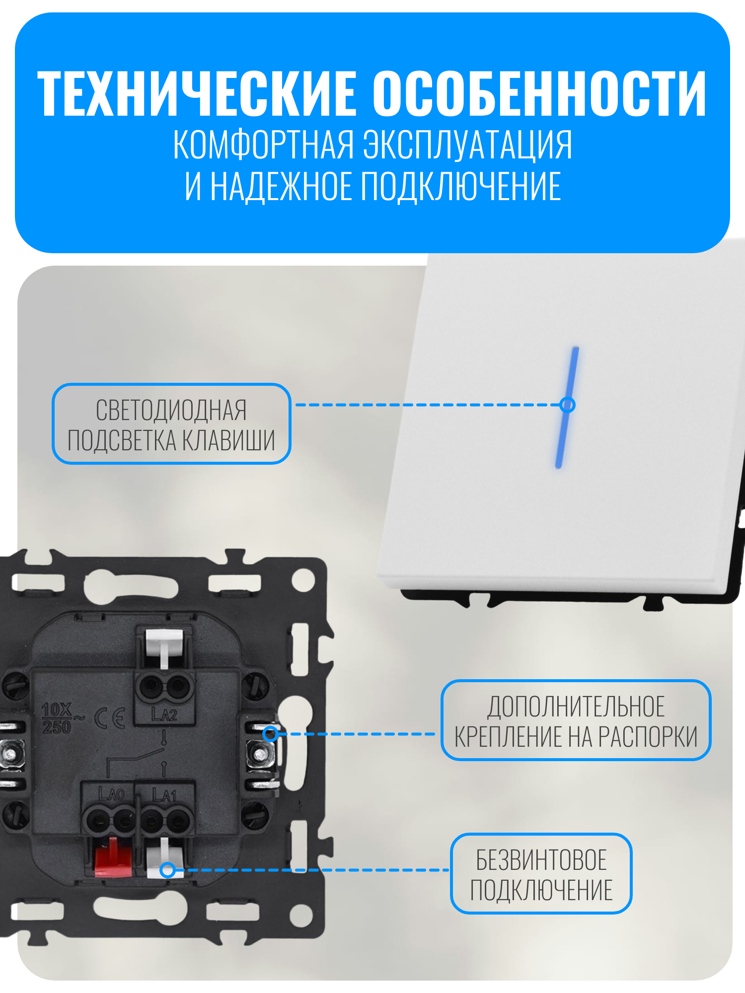 Клавишный проходной выключатель Smart Aura из серии PREMIER — это электрический выключатель, который позволяет управлять одним и тем же источником света из двух разных мест. Модель оснащена светодиодной подсветкой для удобства использования в темное время суток. Так же он оснащён безвинтовыми быстрозажимными клеммами, которые позволяют легко и быстро подключать электрические провода. Для изготовления выключателя используются прочные и безопасные материалы, а конструкция разработана с учетом требований надежности и долговечности. Эта модель отличается современным дизайном, который гармонично впишется в любой интерьер. Особое внимание в серии PREMIER уделено внешнему виду — рамка выключателя имеет минимальную толщину, благодаря чему изделие выглядит элегантно и аккуратно на стене.