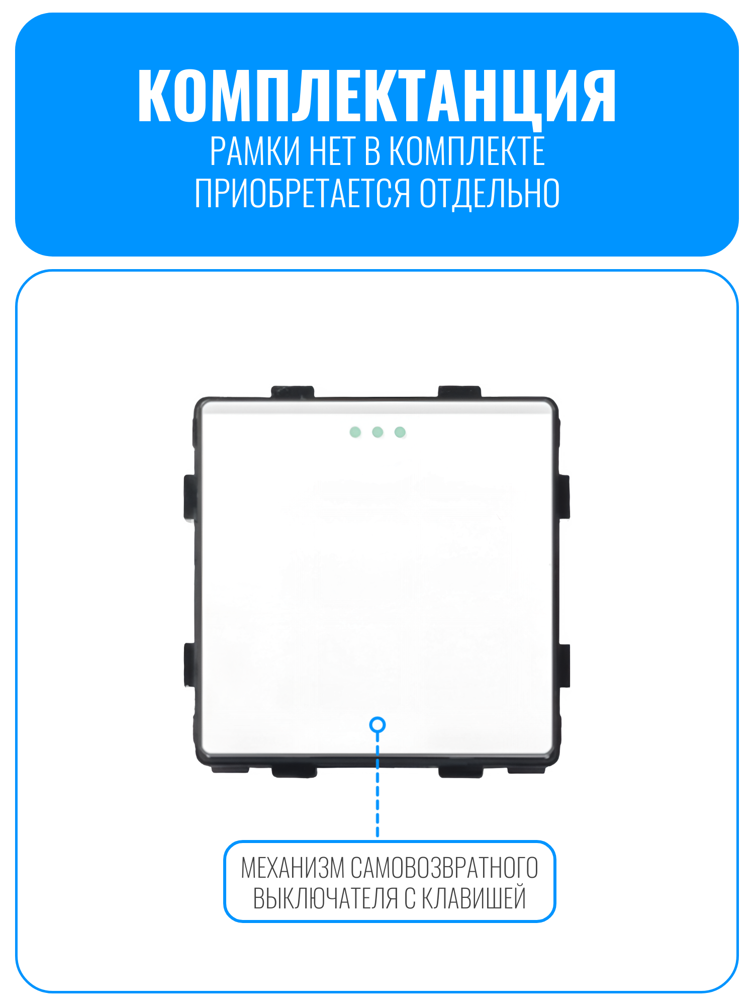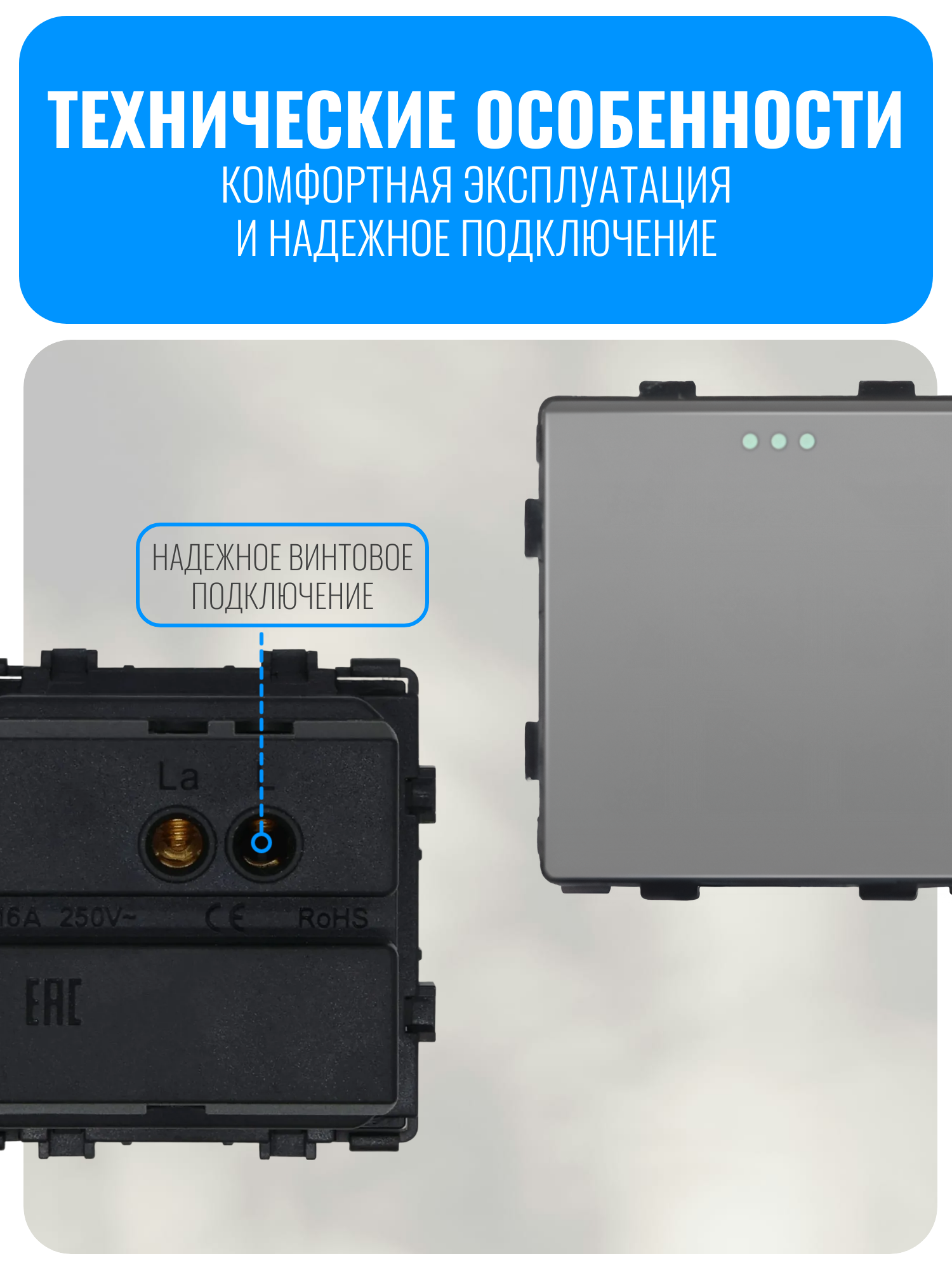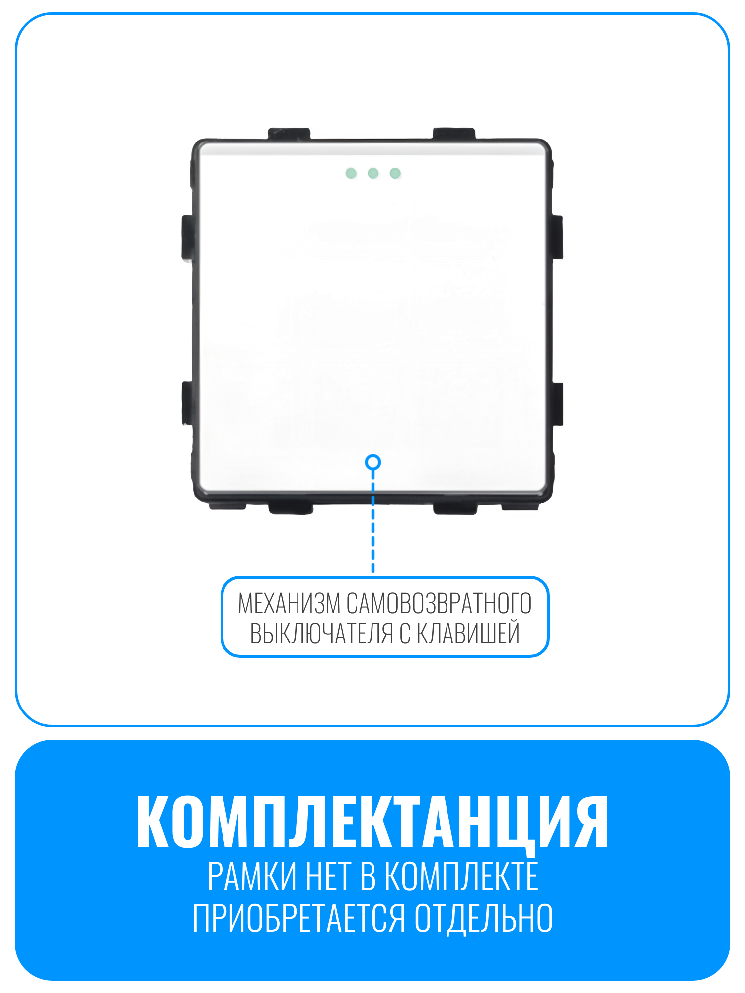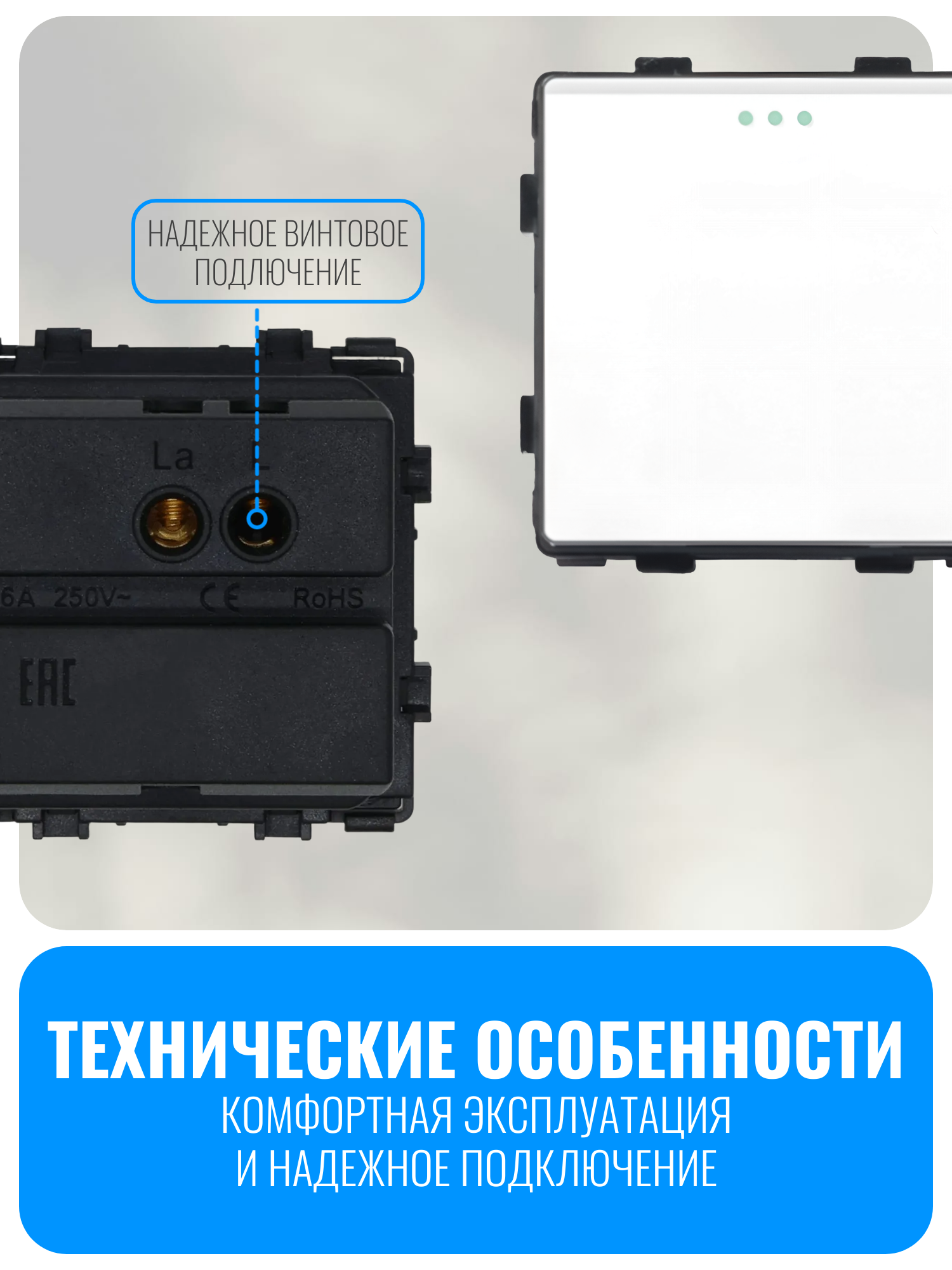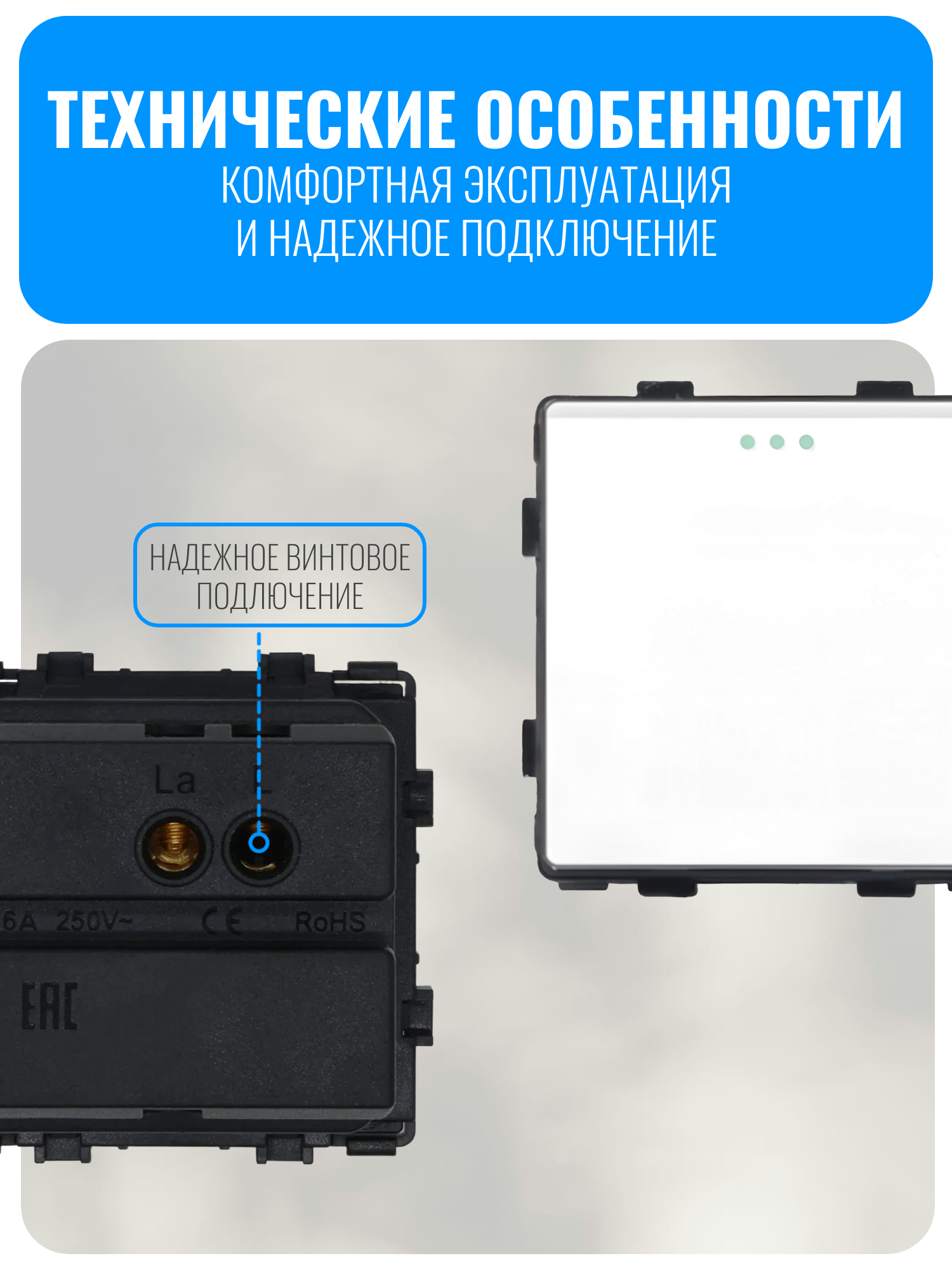 Выключатель можно установить как вертикально, так и горизонтально, что упрощает его интеграцию в любой интерьер. В комплекте поставляется только модуль выключателя, рамку нужно приобрести отдельно. Это позволяет выбрать рамку подходящего цвета и материала, чтобы она гармонично вписывалась в дизайн помещения.