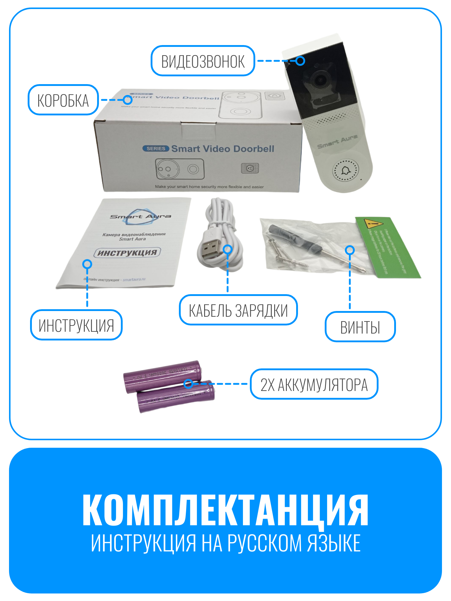 Видеозвонок, аккумуляторы, кабель зарядки, винты, инструкция