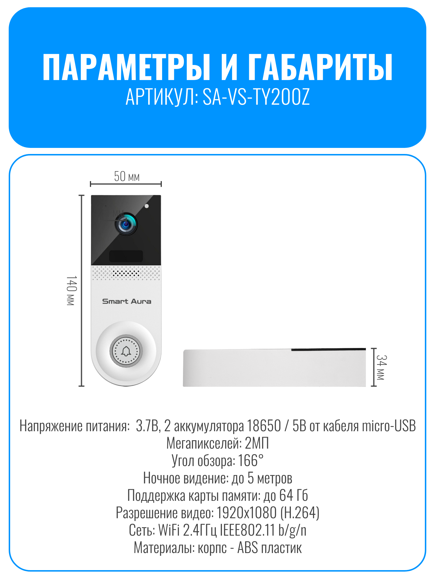 Wi-Fi видеозвонок Smart Aura SA-VS-TY200Z предоставляет возможность вести видеосвязь с человеком, находящимся за дверью, используя ваш смартфон, независимо от вашего местоположения. Это устройство оснащено датчиком обнаружения, благодаря которому, как только кто-то окажется в зоне его действия, видеозвонок автоматически отправляет уведомление на ваш смартфон и активирует подсветку кнопки звонка. Это позволяет всегда быть в курсе происходящего у вашей двери. Дополнительно, видеозвонок оснащен функцией автоматического включения ночного видения, что обеспечивает четкое изображение даже при слабом освещении.